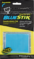 Use to mount posters; drawings; decorations; photos; cards and notes. Holds shelf paper; vases; wires and potted plants in place. Holds needles; hook and fishing lures. Levels pictures. Support Craft and figurines. Adheres to wood; metal; tile; glass; porcelain, plastic laminate, fabrics, paper, styrofoam, plastic, vinyl and painted surfaces. Non-toxic. Removable blue adhesive that replaces tape, tacks, and nails.