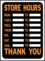 Brightly visible; fluorescent letters on a black background. Durable plastic; weatherproof. Sign states "STORE HOURS"; with slots to write in hours of operation.